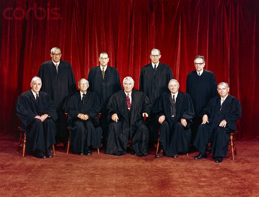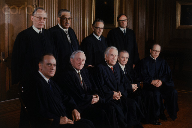 20 Apr 1972, Washington, DC, USA — Original caption: This formal portrait of the U.S. Supreme Court Justices was made as the membership changed. Justices Powell and Rehnquist both took their seats on January 7th, 1972. Left to right in the front row is Potter Stewart, William O. Douglas, Chief Justice Warren E. Burger, Associate Justices William J. Brennan Jr., and Byron R. White. In the back row is Associate Justices Lewis Powell Jr., Thurgood Marshall, Harry A. Blackmun, and William H. Rehnquist. — Image by © Bettmann/CORBIS
